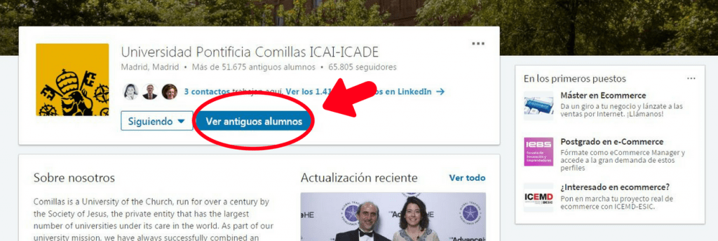 En función de los parámetros que modifiques saldrán más o menos perfiles. Por ejemplo, si hacemos una búsqueda general en la Universidad Pontificia de Comillas aparecen cerca de 50 mil antiguos alumnos. Pero si elegimos sólo “Madrid y alrededores”, la cifra nos baja hasta los 30 mil.